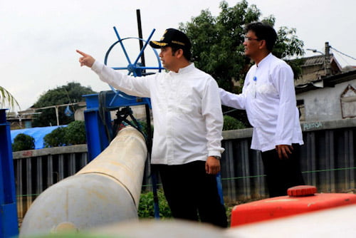 Terus menyusuri sepanjang turap, Arief melakukan pengecekan kembali beberapa titik pompa air di sepanjang Perumahan Garden City Residence.