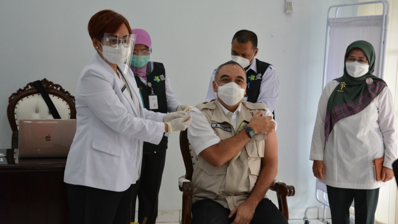 BANTENNOW.COM, TIGARAKSA – Bupati Tangerang A. Zaki Iskandar bersama 13 pimpinan Forkopimda se-Banten jalani vaksinasi Covid-19 perdana.