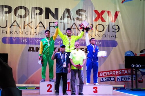 Atlet Banten, Rizki Juniansyah dari cabang angkat besi kelas 73 kg putra berhasil meraih medali emas di ajang Popnas XV 2019, di Jakarta 16-25 November 2019.
