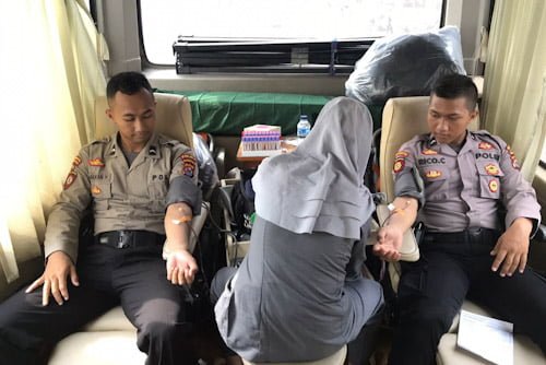 SERANG, (BN) – Personil Direktorat Samapta Polda Banten, ikut donor darah yang diselenggarakan Bank BRI di alun-alun Barat, Kota Serang, Sabtu, (23/11/2019).