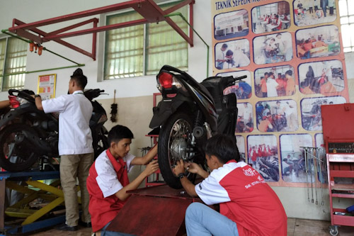 “Anak-anak siswa SMK Istimewa yang kelas XII (12), hari ini melaksanakan ujian praktek tekhnik sepeda motor Honda,” terang Esty.